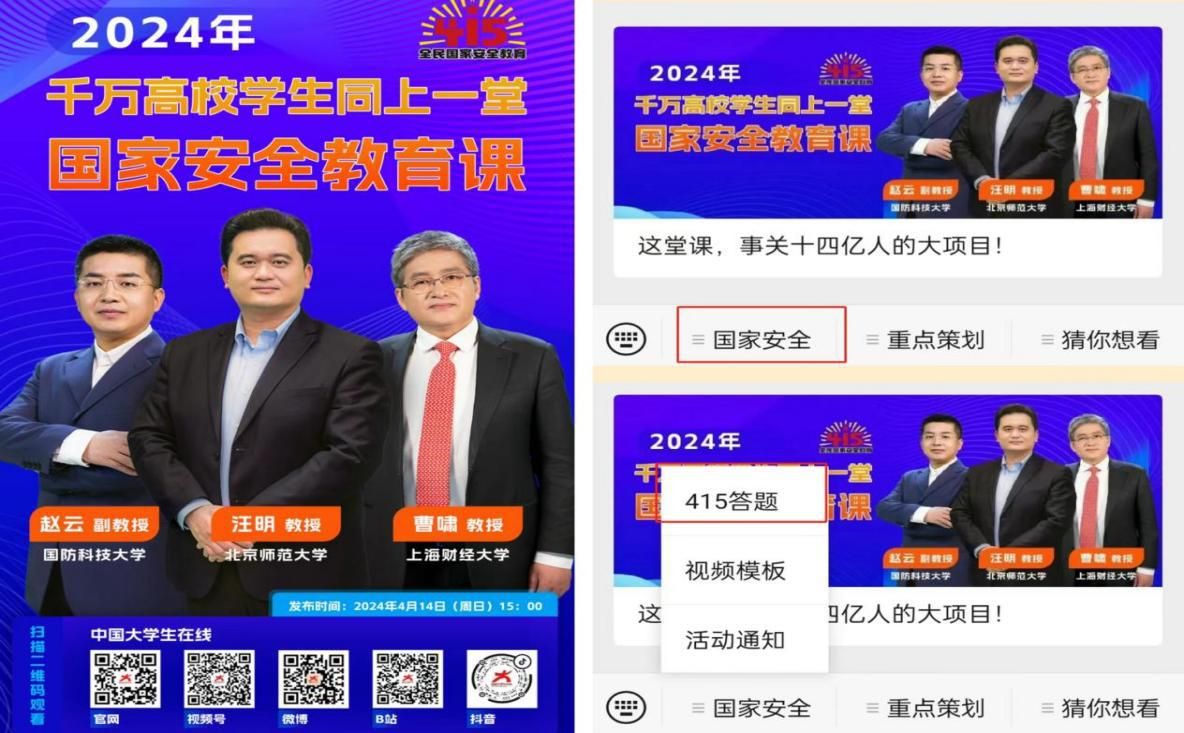学校积极组织广大师生参与“全国大学生国家安全知识答题”活动、观看“人人争当国安卫士”国家安全教育公益课、以“千万高校学生同上一堂国家安全教育课”为主题的公开课、“高校国家安全视频公开课”以及“国开大讲堂·国家安全教育公开课”,感悟新时代国家安全的丰富内涵和外延,不断增强广大师生国家安全意识。
