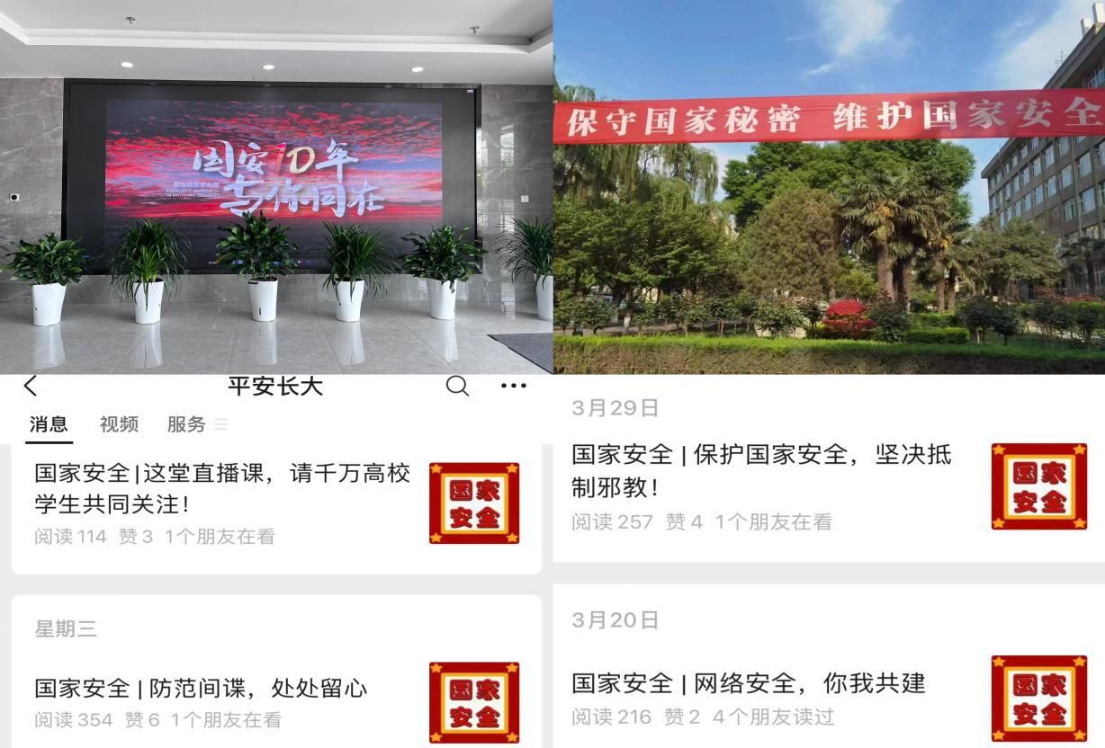 自宣教活动启动以来,学校通过线上线下相结合的方式在校内开展国家安全宣传教育,在校园主干道悬挂国家安全宣传横幅;利用校园LED电子屏播放4·15国家安全教育日宣传视频,滚动播放国家安全相关知识点;充分利用官网、官微及二级单位微信公众号,全方位、多角度科普宣传国家安全教育相关内容,做好“4·15”系列宣传教育推送。