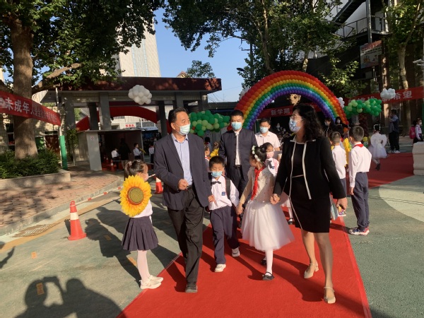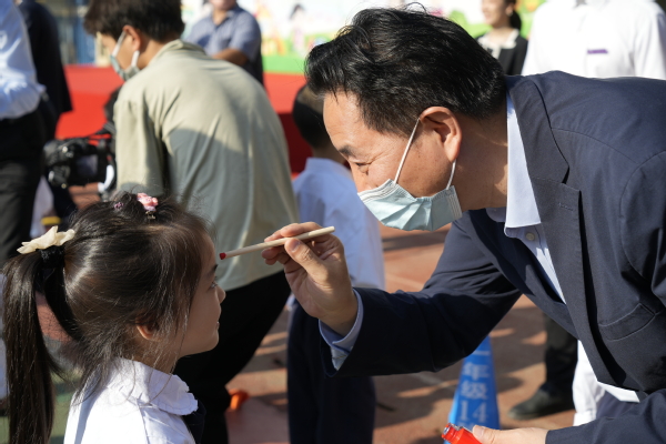 上午,全体一年级新生参加了入学礼仪式。仪式包括“正衣冠”“拜师行礼”“朱砂启智”“赠送校徽”“宣誓”“放纸飞机”等环节,领导和一年级教师一起给孩子们点朱砂、戴校徽,希望孩子们开启智慧、读书明理,努力学习、快乐成长。