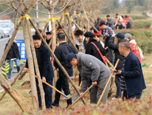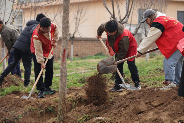 活动现场,在绿化养护人员的指导下,后勤职工与学生志愿者分工协作,体验挥锹挖坑、培土围堰、扶正树苗、浇水施肥的劳动实践过程,现场一派热火朝天的劳动景象,一棵棵元宝枫在春日暖阳和春风吹拂下焕发出盎然生机,为初春的校园再次增染一抹新意。