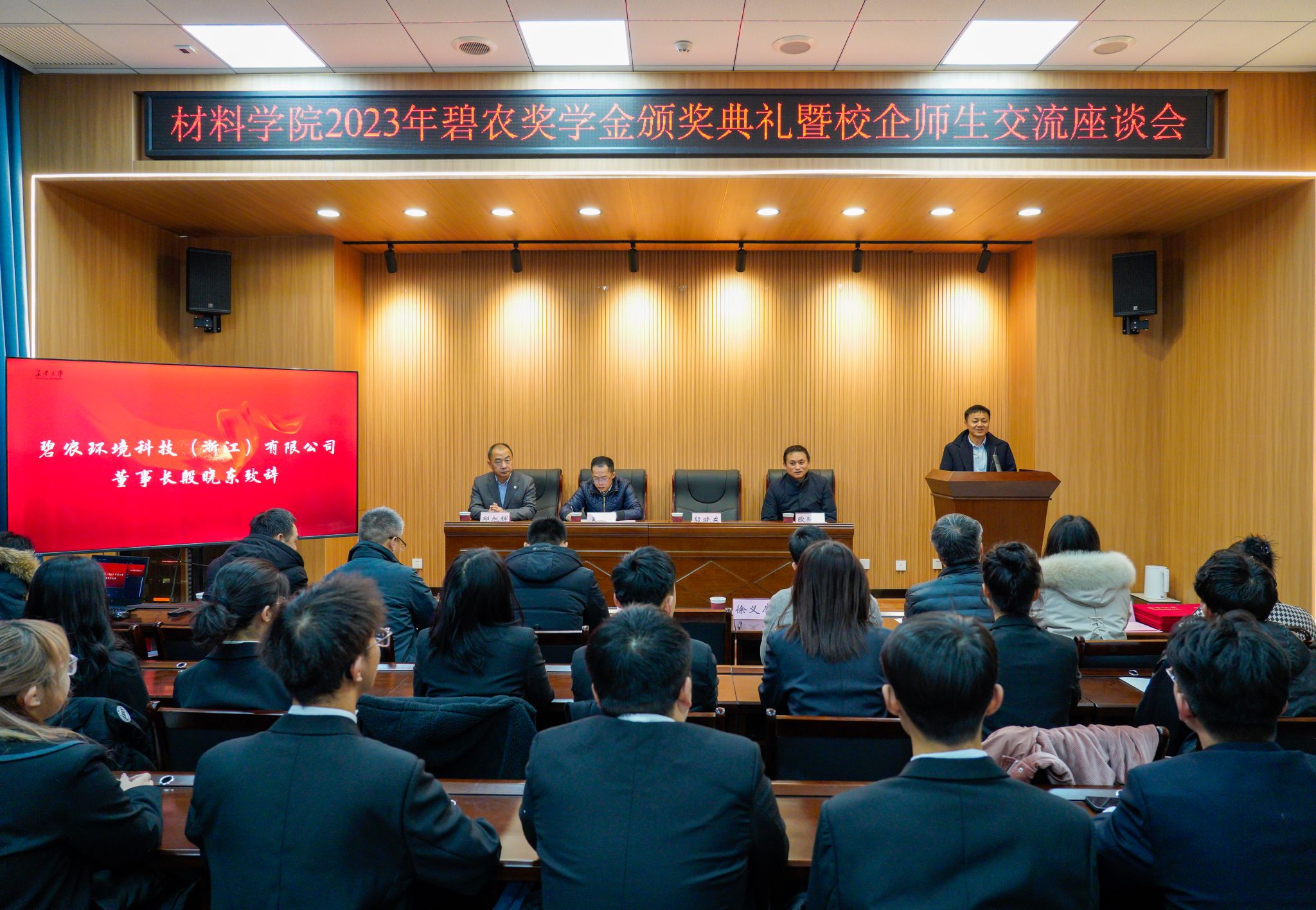 为进一步深化资助育人成效,激励广大受助学生奋发自强、立志成才、感恩奉献,12月21日上午,材料科学与工程学院于北校区致远大厦三层报告厅举行2023年碧农社会奖学金颁奖典礼暨校企师生交流座谈会。捐资助学企业碧农环境科技(浙江)有限公司董事长殷晓东、行政总监唐天勇,bat365社会合作处副处长邱旭辉、资助中心主任欧阳韬、学院院长肖月、副院长徐义库、对外合作交流中心主任齐琳、成型及控制工程系周亮、学生工作办公室主任杨树等教师代表、各年级学生代表参加典礼。典礼由学院党委副书记张晓琳主持。