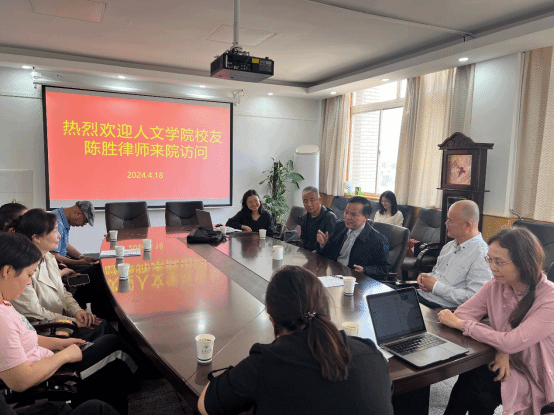 4月18日上午,人文学院校友、北京大成(上海)律师事务所高级合伙人、人文学院校友陈胜律师一行三人回校访问,与人文学院法学系教师和研究生座谈交流,会议由人文学院法学学科组组长陈蓉教授主持。