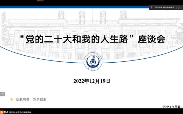 为深入学习贯彻党的二十大精神,充分发挥“五老”育人优势。12月19日,理学院召开“党的二十大和我的人生路”师生座谈会,邀请理学院原党委书记姜洪,原副院长王虎、刘建民与学生共同学习党的二十大精神,分享人生奋斗故事。学院党委副书记屈颖,本科生党支部党员、“青马班”成员参加本次座谈会,会议由本科生党支部书记杨雪菲主持。