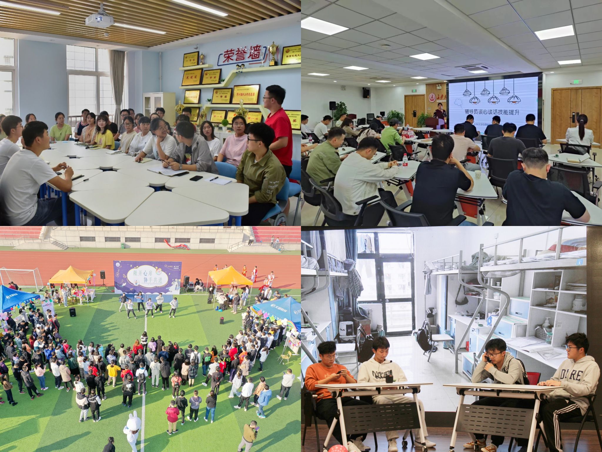 构建朋辈互助队伍,发挥同伴“互助”力量。彩虹志愿者连续9年组织新生“破冰行动”——新生团体辅导,帮助新生在入学初期更迅速地了解彼此,建立友谊。连续10年做实心理健康服务类“彩虹使者进宿舍”品牌,通过打造一支由72名彩虹使者、26名学生骨干建立彩虹使者联系宿舍常态化机制,建立自上而下和自下而上的双向协同工作机制。每月召开一次彩虹使者培训会,指导彩虹使者深入学生宿舍了解学生心理动态,不断提升彩虹使者服务能力和“互助”成效。积极开展心理委员工作能力培训,在学习生活中敏锐发现同学的心理变化。