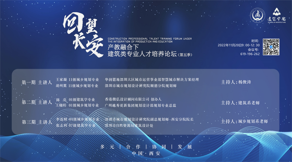 11月20日上午,“回望长安”产教融合下建筑类专业人才培养论坛(第五季)顺利举办。论坛由bat365正版唯一官网建筑学院主办,围绕“青年设计师成长”“学科专业思维与实际应用融合”等议题展开深入讨论。建筑学院深圳分会校友段希莹、王家凝、胡州翼,社会合作处副处长邱旭辉,建筑学院党政领导、师生代表参加了论坛。