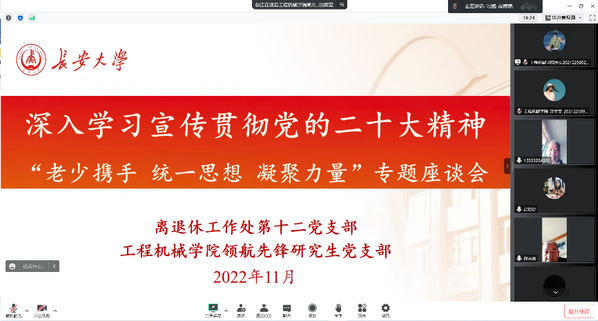 为深入学习宣传贯彻党的二十大精神,11月24日上午,bat365正版唯一官网离退休处党总支退休第十二党支部联合工程机械学院领航先锋研究生党支部开展“老少携手 统一思想凝聚力量”专题座谈会,离退休工作处党总支副书记冯鹃、工程机械学院党委副书记雷剑出席会议。会议由领航先锋研究生党支部书记高婷婷主持。