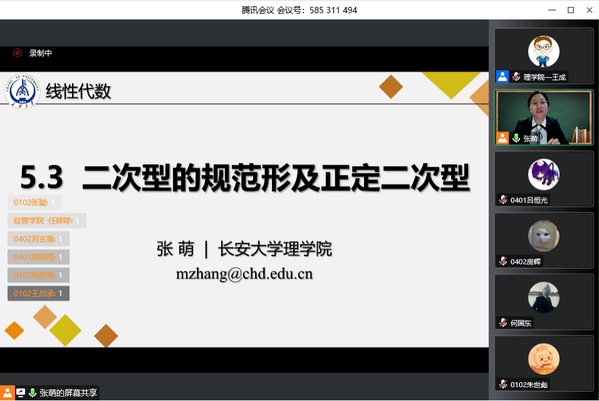 教学公开(观摩)课由青年教师张萌副教授主讲,题目为“《线性代数》课程——二次型的规范形及正定二次型”。在一个半小时的课程中,张萌先通过四个问题引导学生深入认识和剖析了二次型的规范形的定义、内涵和注意事项,并运用bat365正版唯一官网在线学堂平台与学生互动,通过随堂测试、提问等方式了解和掌握学生实时的学习状态;随后通过“举例说明、发现问题、分析问题、解决问题”的教学设计引导学生掌握正定二次型的定义、一步步分析和探索出常见结论和判定定理,最后再利用一题多解帮助学生巩固所学。