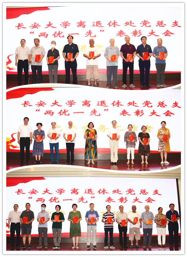 离退休处党总支书记薛庆文和处长王卫为受表彰的集体和个人代表颁发证书。