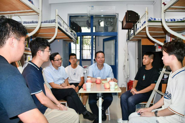 座谈结束后,学院领导一行来到学生宿舍,向同学们送上月饼、苹果等慰问品,和同学们团坐一堂,其乐融融。