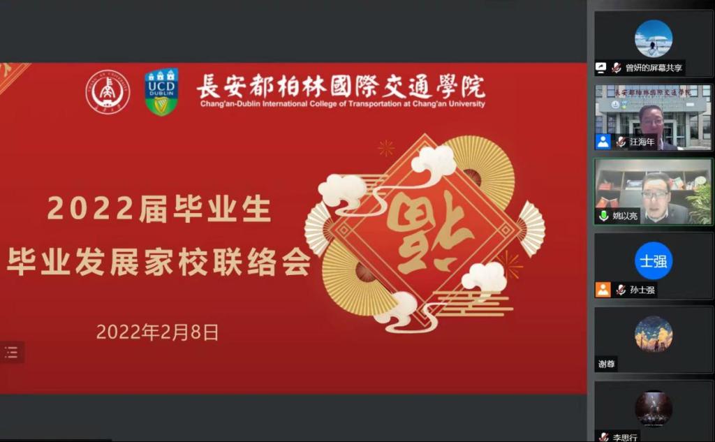 2022年2月8日19点,为促进学院毕业生高质量就业发展,针对性开展学生发展规划服务,进一步加强家校互通,长安都柏林国际交通学院通过线上方式召开了2022届毕业生职业发展规划工作推进会。学院党总支书记、院长汪海年,副院长柏强,教学教务部、学生事务部、国际交流中心相关老师以及2022届毕业生及其家长参加了本次会议。会议由学院党总支副书记、副院长姚以亮主持。