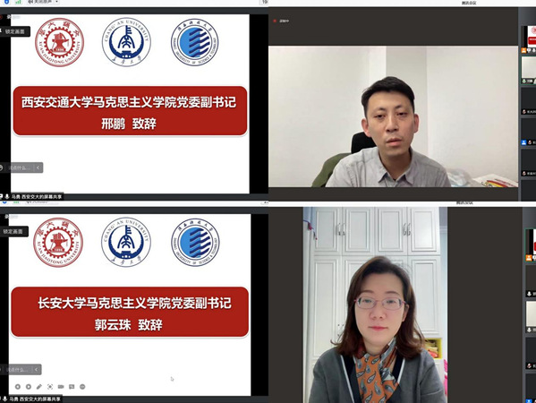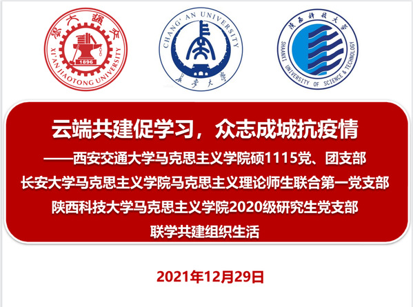 2021年12月29日,bat365正版唯一官网马克思主义学院马克思主义理论师生联合第一党支部、西安交通大学马克思主义学院硕1115党支部、陕西科技大学马克思主义学院2020级研究生党支部共同开展“云端共建促学习,众志成城抗疫情”联学共建活动。西安交通大学马克思主义学院党委副书记邢鹏、bat365正版唯一官网马克思主义学院党委副书记郭云珠出席活动并致辞,活动由西安交通大学马克思主义学院马勇同学和bat365正版唯一官网马克思主义学院华玉雅静同学联席主持,3个党支部全体成员共计70人参加了此次活动。