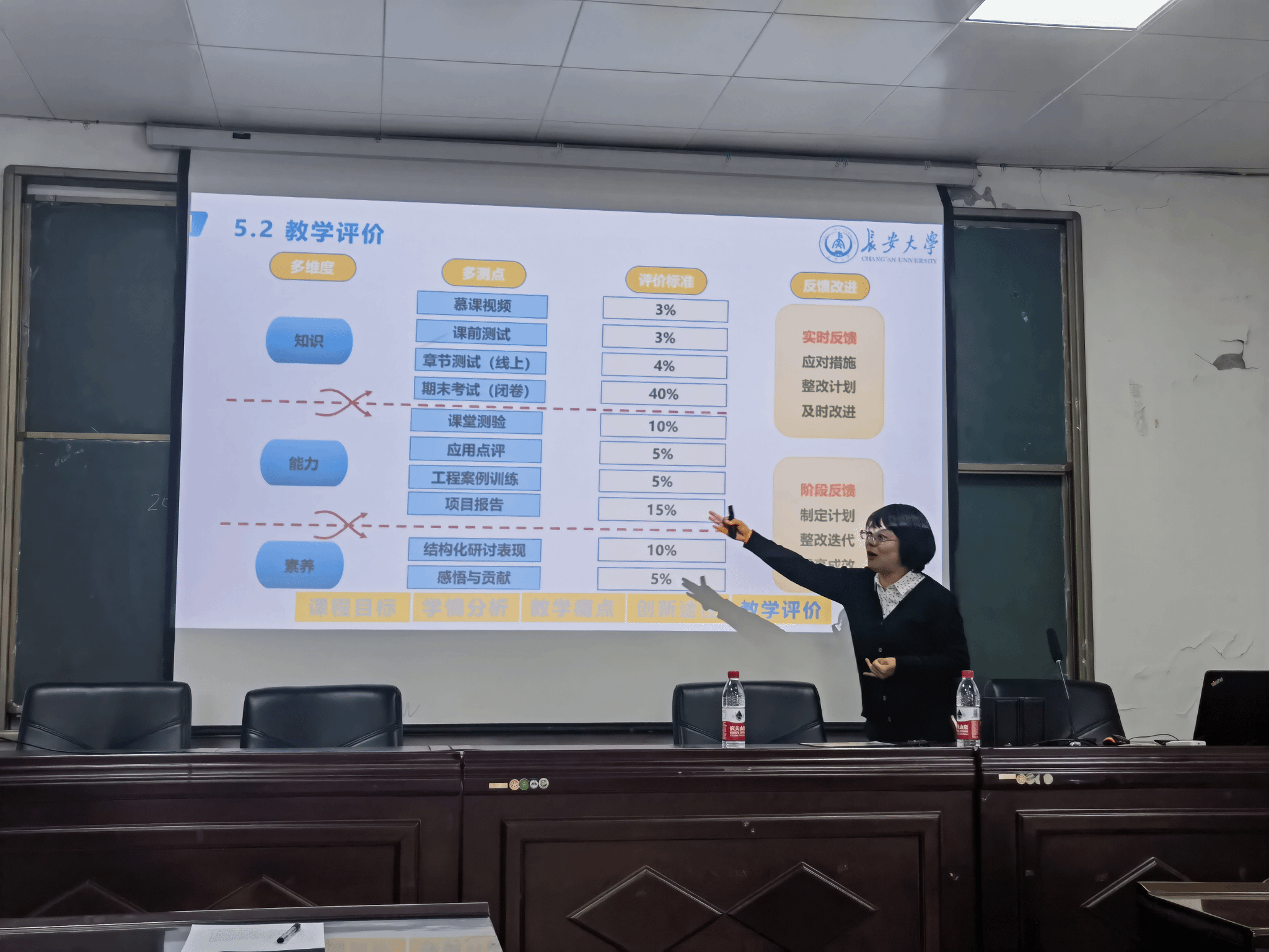 会上,程海鹰教授结合课程建设历程,系统介绍了课程建设思路,分享了课程教学改革经验,同时针对课程目标、学情分析、教学痛点、教学途径、教学评价等五个方面进行了细致讲解。她结合第五届陕西本科高校教师教学创新大赛申报要求,深入分析了教学创新大赛中的要点和难点,并就自己课程建设和教学创新比赛中出现的问题提出反思及建议。