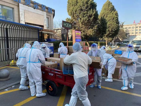 12月14日起,北校区校区门诊部接到自我隔离的通知,学校急需的防疫物资后续不断送达门诊部,第一批就有1万套防护服、50箱抗菌洗手液、50箱免洗消毒凝胶、30箱84消毒液、20箱75%-500hm酒精、10箱医用外科口罩、10箱乳胶手套、10箱靴套、5箱外科手套、5箱面屏等防疫物资。接到货物的第一时间,身躯单薄的女同志肖妮娜负责冲在前面,带领留守北校区门诊部的刘倩文、景宇瑶、李建珉、刘晓卫等4位“战友”一起,拉着板车、扛起沉重的箱子,与时间赛跑干起来,同时值班的保安、司机、保洁人员也闻讯加入队伍,大家齐心协力,任劳任怨,不到1小时就将一吨重的防护物资,高效有序地完成卸货、搬运、登记、清点、入库,顺利保障了北校区防疫物资需要。这样的保障每天如此,直到12月19日北校区门诊部全部留守人员被集中隔离。
