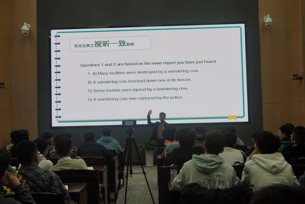林奕航向同学们介绍了四级听力的方法与技巧,通过对大量四级真题的详尽讲解,帮助学生解决四级听力题型的难点问题,同时围绕英语四级口试的回答技巧展开辅导。