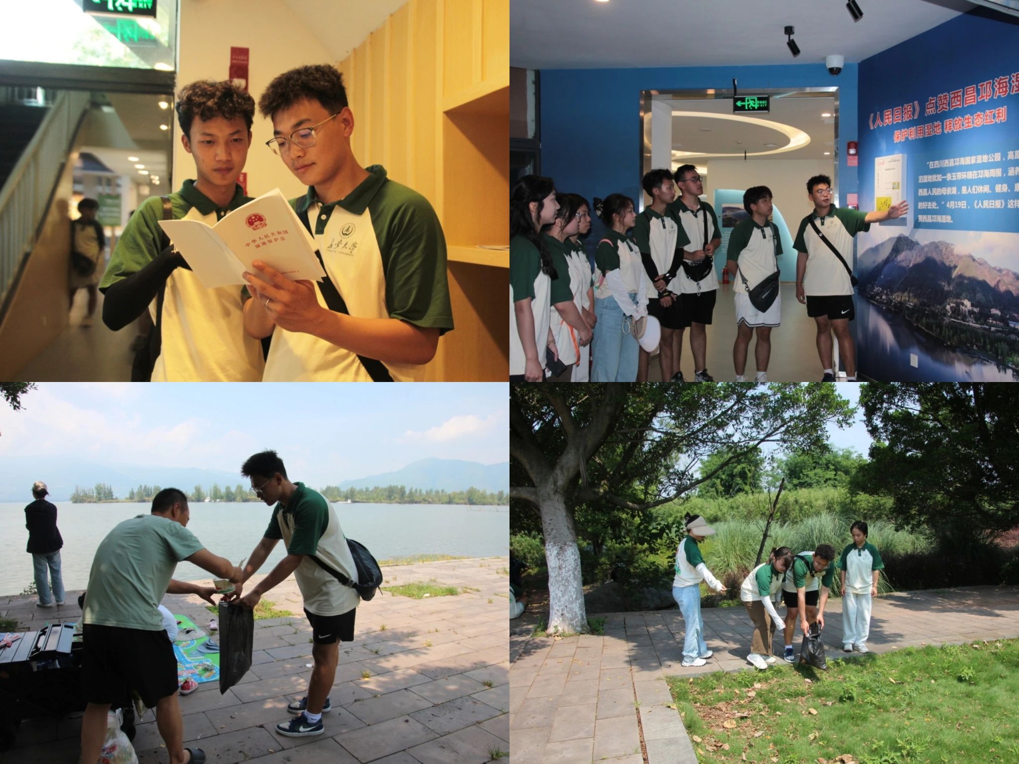 汇聚青春力量,建设美丽中国。在西昌邛海湿地宣教中心,队员们全方位了解了邛海湿地的50年变迁历史、邛海湿地保护修复工程取得的成效、保护湿地野生动植物的重要价值和意义等。参观结束后,实践队员们沿着邛海岸边步道开展净滩行动和沿邛海骑行活动,以实际行动呼吁大家从自身做起,积极行动,保护自然环境,共建美丽家园。