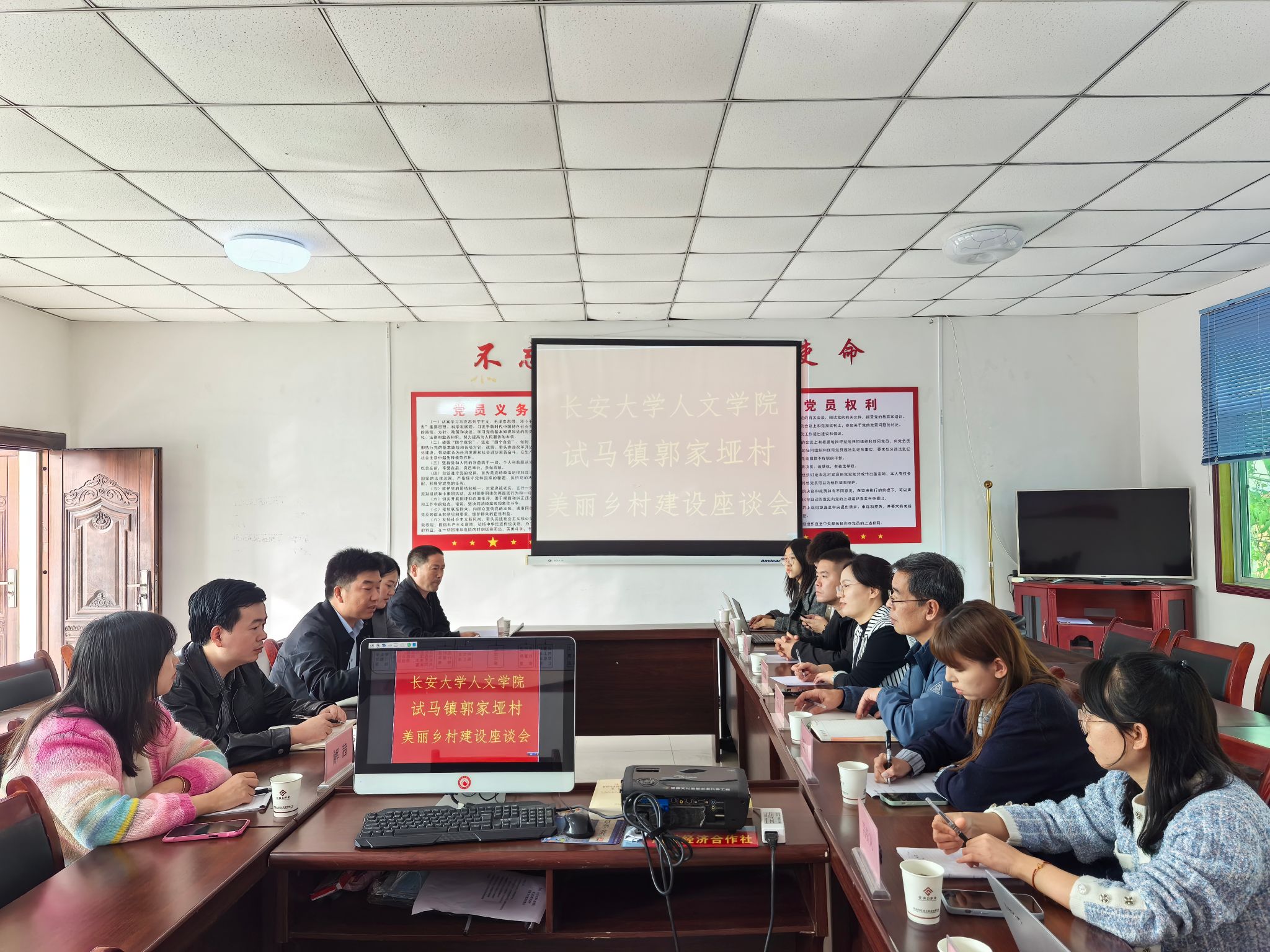 10月24日下午,何红娟一行8人赴商南县试马镇郭家垭村与村政府工作人员开展乡村振兴美丽乡村建设座谈会。会上,试马镇党委副书记、镇长陈涛详细介绍了镇上发展情况及现存的瓶颈问题。针对相关问题,学院青年党员教师积极献言献策,并表示愿意在今后的帮扶过程中提供智力支持。何红娟表示,在国家实施乡村振兴战略的背景下,人文学院将积极对接郭家垭村发展需求,持续发挥学院学科专业和人才优势,在美丽乡村建设、乡村治理、文化宣传、基层党务、普法下乡、普通话推广等多个领域开展合作,助力郭家垭村早日实现农业农村现代化,打造产业兴旺、生态宜居、乡风文明、治理有效、生活富裕的美丽家园。