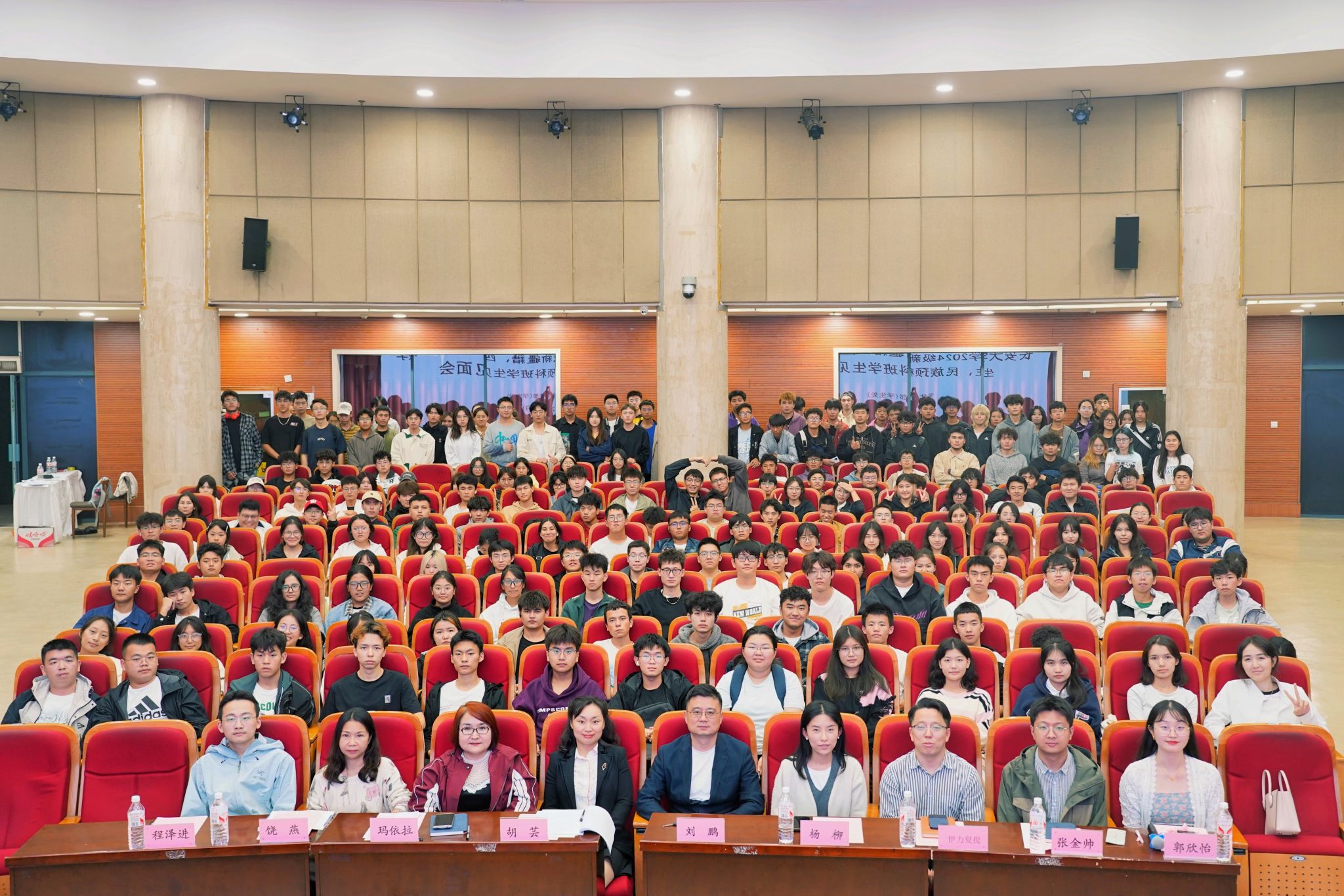 水环学院团委书记伊力夏提·奥斯曼,民族预科班辅导员郭欣怡,新疆派驻教师饶燕,兼职辅导员张金帅、程泽进,2024级新疆籍、西藏籍民族学生,民族预科班学生共240余人参会。