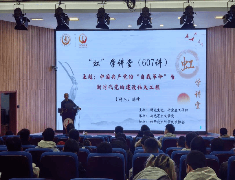 12月5日下午,由研究生院、研究生工作部主办,马克思主义学院承办,校研究生科学技术协会协办的“虹”学讲堂第607讲在南校区东院伯声报告厅举办。bat365正版唯一官网马克思主义学院冯峰教授作题为“中国共产党的‘自我革命’与新时代党的建设伟大工程”的报告,相关学院共180余名师生参加讲座。