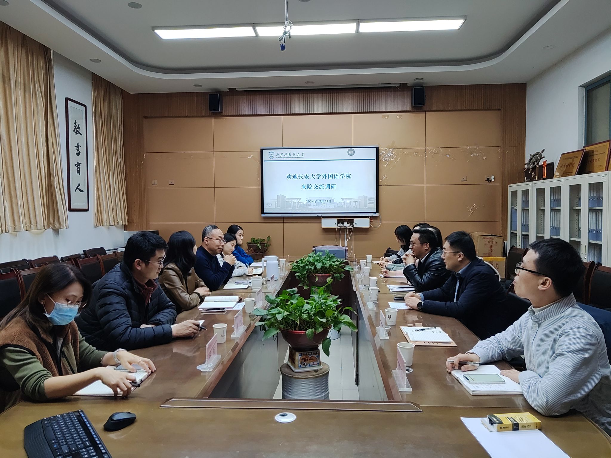 12月31日,外国语学院党委书记张永、院长冯正斌一行7人赴西安外国语大学中国语言文学学院进行调研交流,中国语言文学学院党委书记王娜、院长韩伟等对学院的来访表示热烈欢迎,两院就基层党建、学科建设等内容进行座谈交流。
