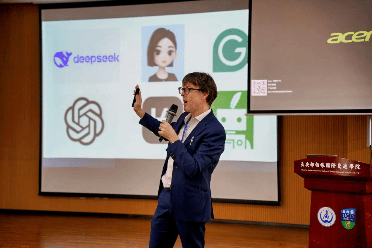 3月12日和14日中午,长安都柏林国际交通学院举办了两场主题为“生成式人工智能在英语教学中的机遇与挑战”专题讲座,邀请爱尔兰都柏林大学应用语言研究中心Alex Runchman博士作报告。学院英语课程中外任课教师、外语学院教师代表及学生代表参加,共同探讨生成式人工智能(Generative AI)在英语教学中的应用前景、挑战及对策。