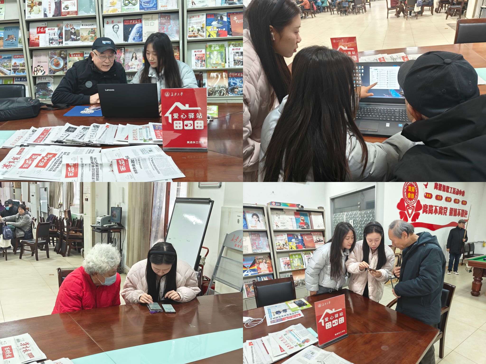 志愿服务期间,志愿者们两人一组,在驿站内轮番值守,化身“技术专家”,向老教师们推荐“离退休工作管理平台”,并讲解其安装与使用方法;同时精心组织开展“智能生活”线下咨询服务,通过“面对面”“手把手”的教学,为老教师答疑解惑,打破科技屏障,享受电子信息带来的诸多便利。老教师们面对智能手机、电脑及其他电子设备的操作难题,在同学们的耐心指导下迎刃而解。