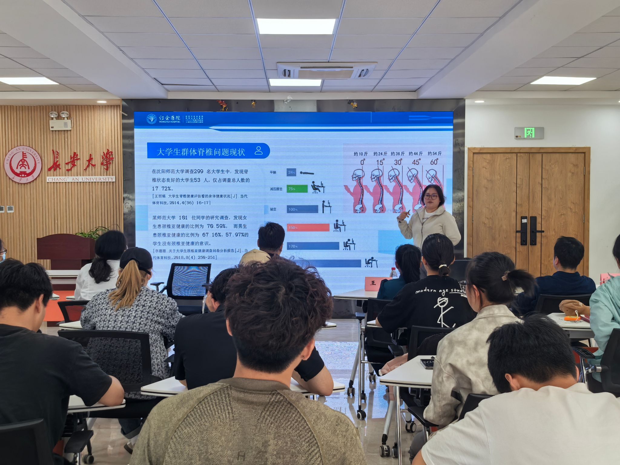 专家通过真实案例演示,详细介绍了常见的运动损伤处置,及外伤止血包扎、心肺复苏(CPR)、海姆立克急救法等实用技能。校医院医护人员现场指导师生进行急救模拟操作。此外,针对师生长期伏案工作的现状,专家以“保护脊柱:长期久坐的应对策略”为题,传授了简易脊柱放松操,并指导运动前的正确热身方法,规避运动损伤。