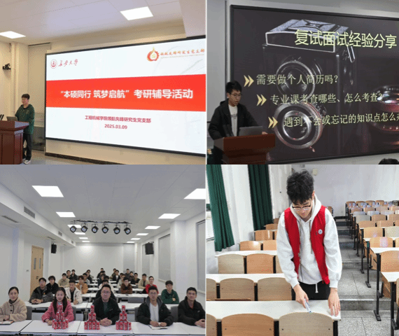 护航成长:本硕联动办实事。打破本硕培养界限,构建全过程学业帮扶体系。开展“本硕同行,筑梦启航”考研复试辅导活动,为30余名考生提供简历优化、面试指导等服务,建立答疑群分享复试技巧。复试期间20余名党员作为志愿者参与考场布置、路线引导等服务。曾被帮扶的多名党员主动加入志愿小组,形成“受助——助人——传承”的良性循环。