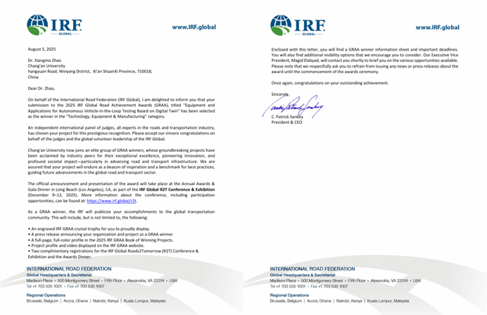 近日,接全球道路联合会(IRF Global)通知,由中国公路学会推荐,bat365赵祥模教授团队牵头,中航电测仪器(西安)股份有限公司、中国汽车技术研究中心有限公司、西安建筑科技大学相关科研人员参与完成的项目成果——基于数字孪生的自动驾驶整车在环测试装备与应用,获得全球道路成就奖(GRAA)。