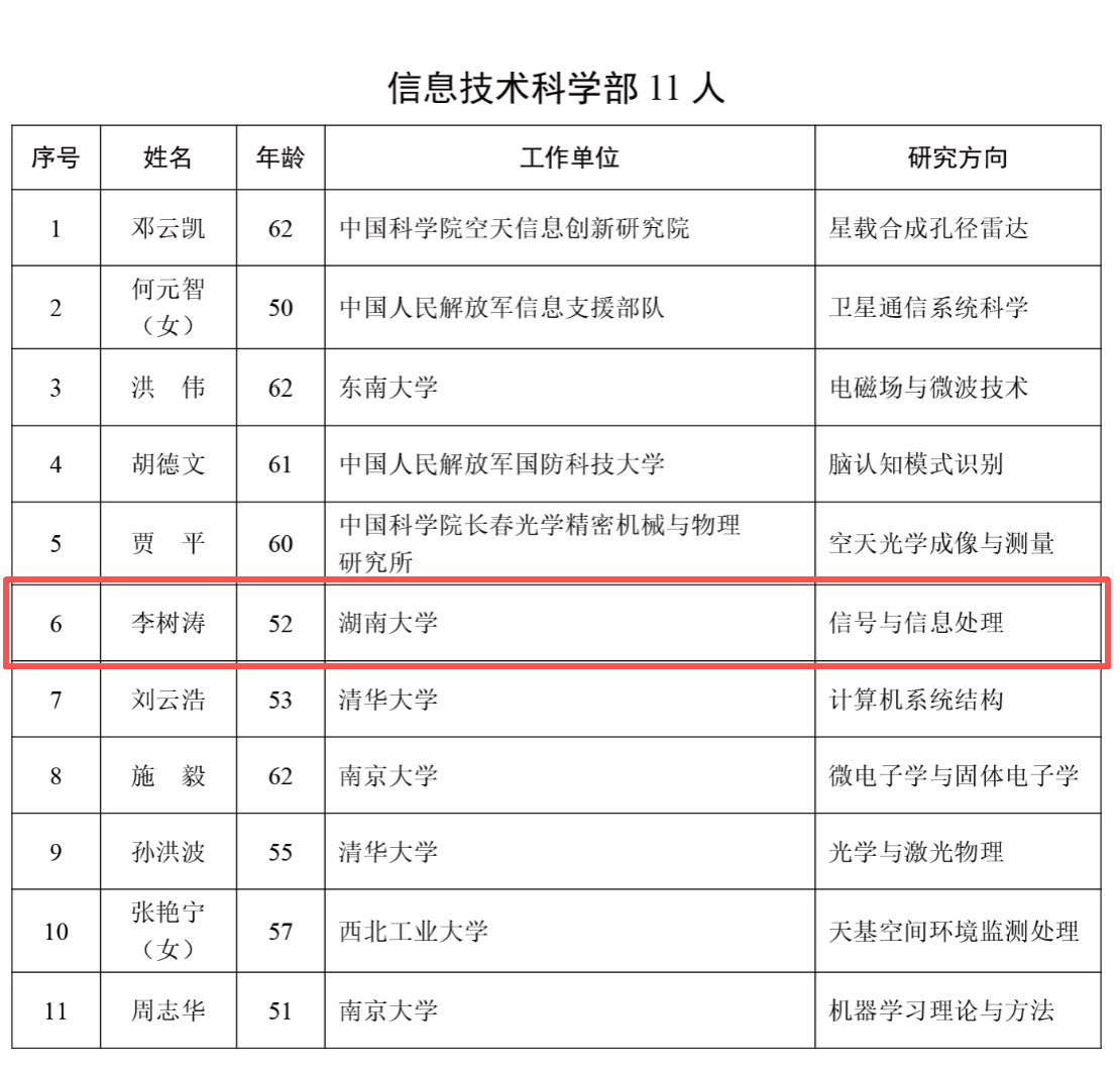 李树涛院士长期从事图像信息融合领域的研究工作,研究成果先后获国家自然科学二等奖2项(均排第1)、国家科学技术进步二等奖2项(排第3、5)、国家教学成果二等奖1项(排第1)、2023年度IEEE GRSS 教育奖、全国创新争先奖、吴文俊人工智能杰出贡献奖、IEEE 地球科学与遥感协会(GRSS)大卫·兰德格里伯奖和 IEEE GRSS 最高影响力论文奖等。