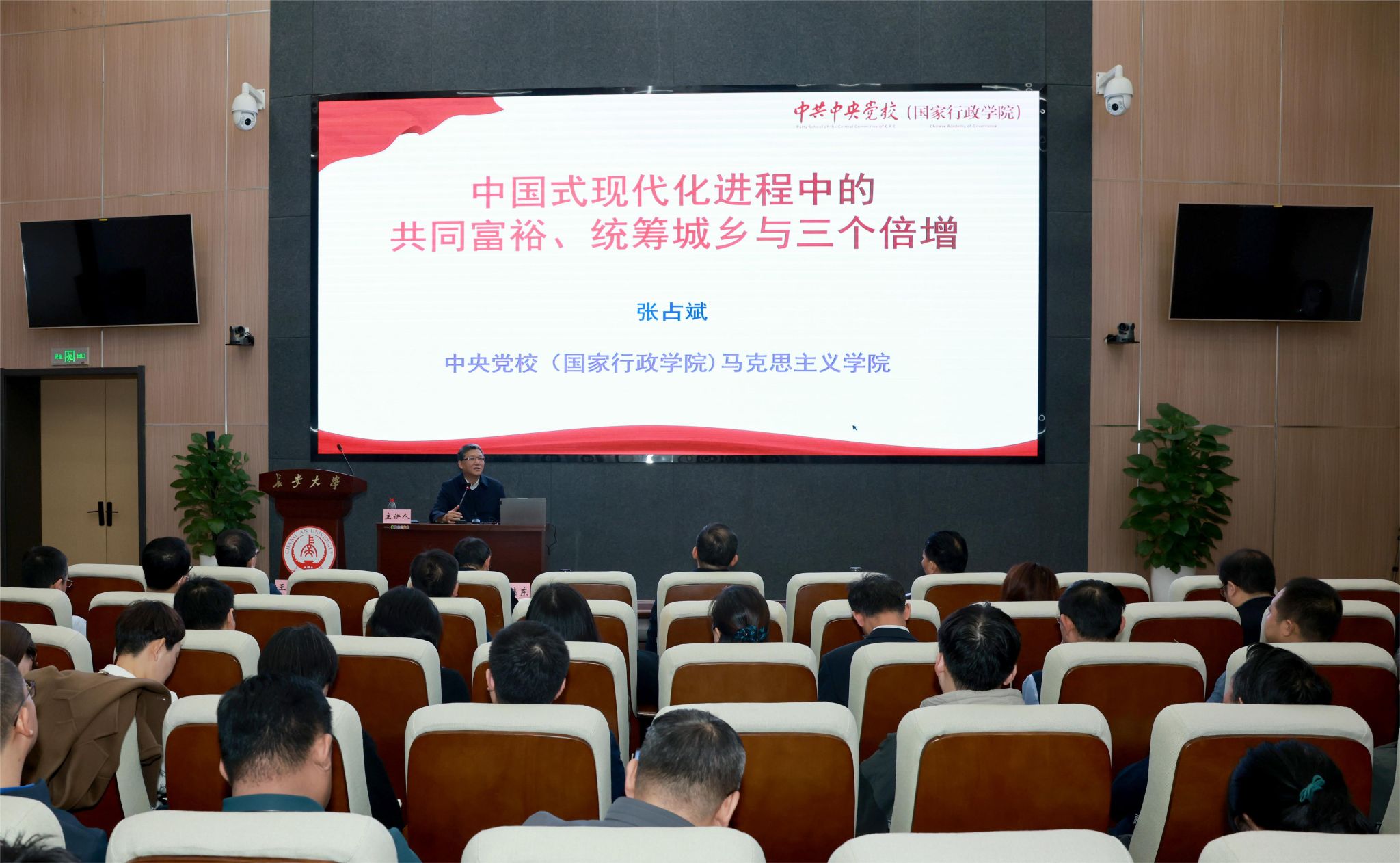 11月23日,学校在北校区师生服务大厅第二报告厅召开校党委理论学习中心组(扩大)学习会议,邀请中共中央党校(国家行政学院)中国式现代化研究中心主任、马克思主义学院教授张占斌作《中国式现代化进程中的共同富裕、统筹城乡与三个倍增》宣讲辅导报告。会议由校党委副书记、纪委书记陶继东主持。会场张占斌从“实现共同富裕的战略目标与实践途径”“统筹城乡融合发展的重要意义和实践要求”“在中国式现代化进程中努力实现三个倍增”...